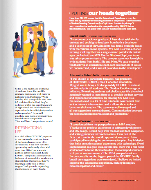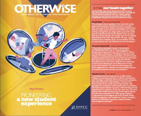 The success of this multifaceted contribution was formally acknowledged by EDHEC. I was prominently featured in EDHEC Otherwise Magazine, the official school publication. This article specifically highlighted the significance of my involvement in the MyEDHEC project, recognizing the depth of my technical and organizational role. This acknowledgment serves as validation of my ability to translate strategic thinking into executable digital projects within a complex organizational environment.
